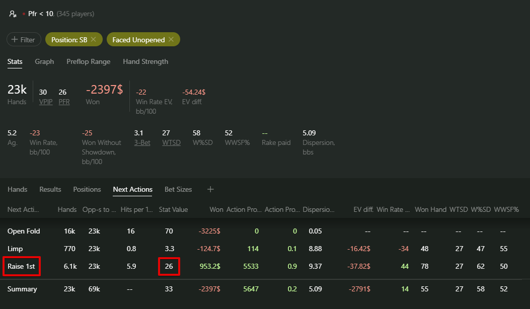 Clicking on the “Next Actions” tab, we can see that the average steal frequency of passive players is 26%. Such a frequency indicates a strong range, so be attentive when choosing hands to defend the big blind against such opponents.