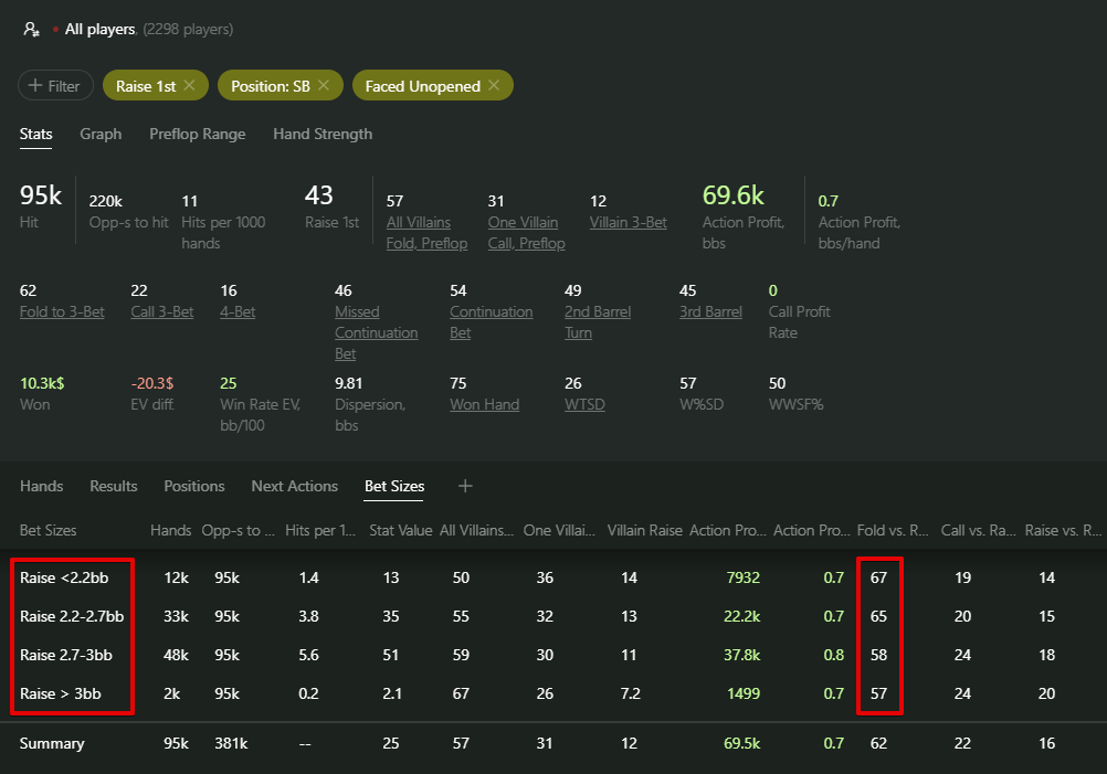 Smart reports in Hand2Note 4 are highly convenient because all the necessary information is always at your fingertips. Clicking on the Bet Sizes tab, we can distinguish a linear trend: the smaller the steal size players choose, the more often they fold to a 3-bet, thus indicating a weaker range.