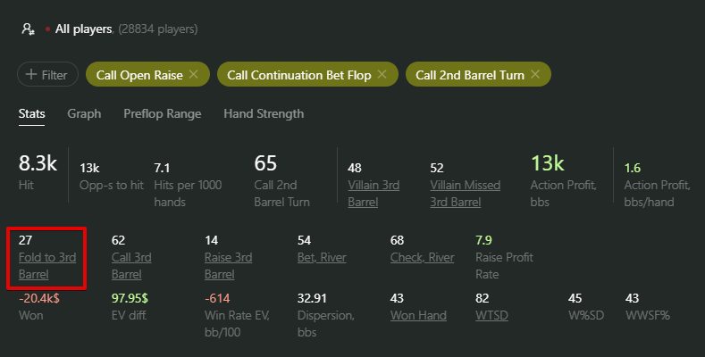 The report shows that such players fold to the third barrel on the river only 27% of the time.