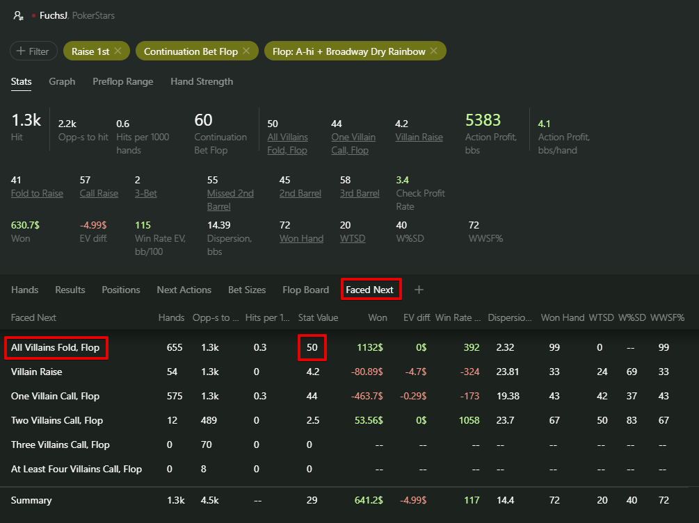 In the “Faced Next” report, we see that in this scenario, I won the pot on the flop 50% of the time.