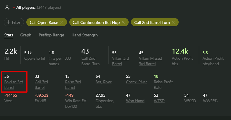Next, I chose scenarios where they consecutively called an open raise preflop, a c-bet on the flop, and a second barrel on the turn: