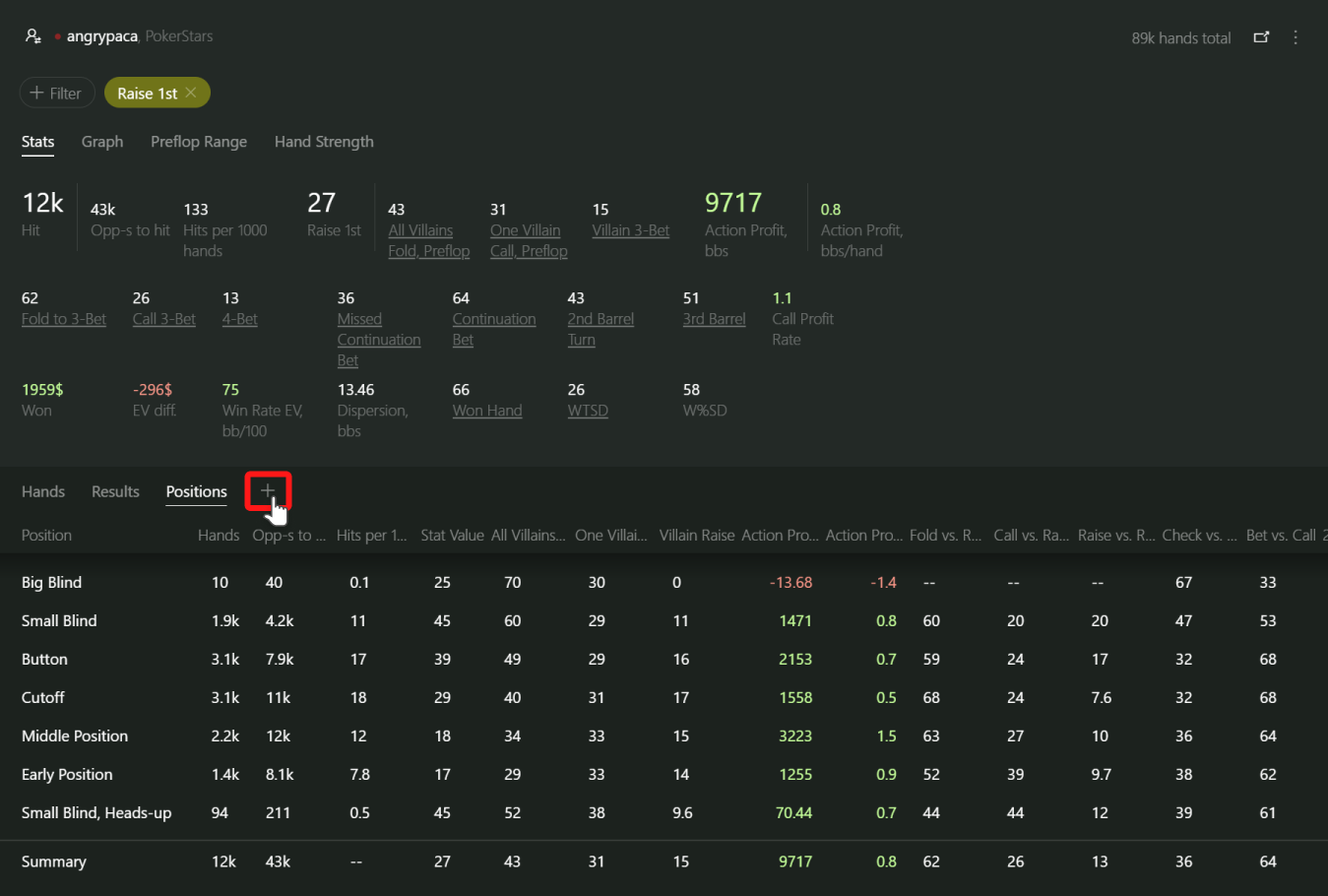 El informe Next Actions es similar al de Faced Actions mencionado arriba. Pero en vez de filtrar por acciones que enfrentamos, Next Actions separa las manos por la acción que tomamos nosotros a continuación.